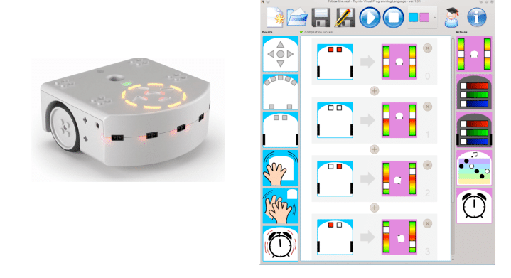 With the Thymio VPL and VPL3 interfaces, you can program Thymio with image blocks in an intuitive way. By combining events and actions, you will change the behavior of Thymio in a few clicks.
